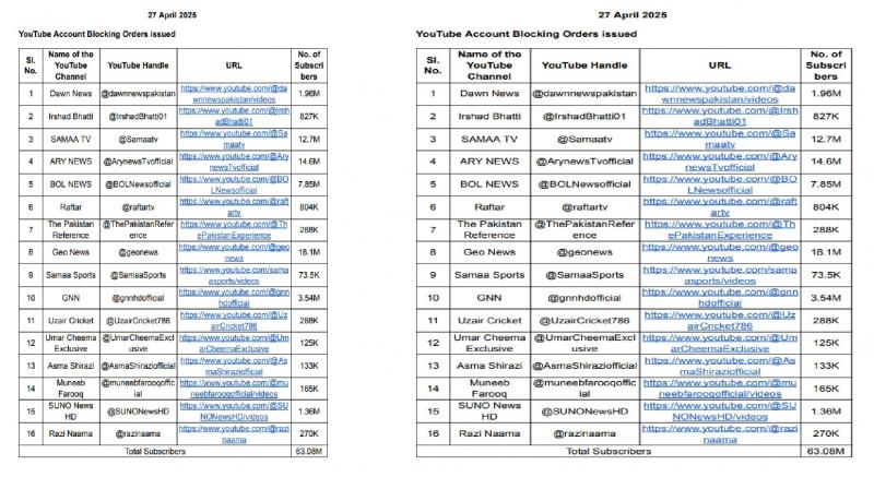 गृह मंत्रालय ने प्रतिबंधित किए गए चैनलों की सूची जारी की है, जिसमें लोकप्रिय पाकिस्तानी समाचार चैनल डॉन न्यूज़, जियो न्यूज़, बोल न्यूज़, एआरवाई न्यूज़, समा टीवी और सुनो न्यूज़ शामिल हैं। इसके अलावा पाकिस्तानी पत्रकारों के कई चैनलों को भी ब्लॉक किया गया है। अन्य प्रतिबंधित हैंडल में उजैर क्रिकेट, द पाकिस्तान रेफरेंस, रजी नामा और समा स्पोर्ट्स शामिल हैं।