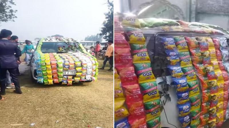 सतपाल यादव नाम के यूजर द्वारा इंस्टाग्राम पर साझा किए गए वीडियो में, दूल्हा एक ऐसी कार में बैठ के आया जिसे आलू के चिप्स के पैकेट और कुरकुरे से सजाया गया है। दिलचस्प बात यह है कि वीडियो को 17 लाख से ज्यादा लाइक्स मिल चुके हैं.