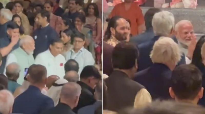 प्रधानमंत्री मोदी ने बैठने से पहले शादी में आए मेहमानों का अभिवादन स्वीकार किया। वीडियो में दिखाया गया कि प्रधानमंत्री मोदी मुकेश अंबानी और अनंत अंबानी के साथ अग्रिम पंक्ति में बैठे थे।