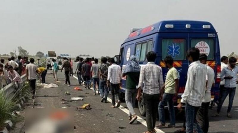 दिल्ली-मुंबई एक्सप्रेसवे पर इब्राहिमबास गांव के पास तेज रफ्तार पिकअप वाहन ने सफाई कार्य में जुटे कर्मचारियों को टक्कर मार दी